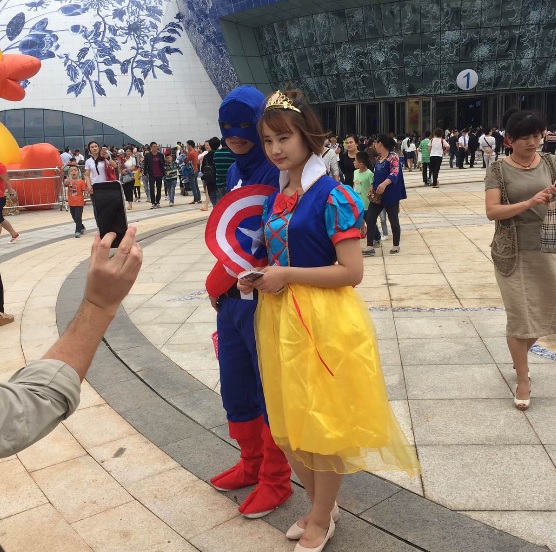 The people dressed as Snow White and Captain American were posing for pictures with visitors in a non-ticketed area of the complex. Stuffed animals resembling the characters Pokemon and DreamWorks’ Kung Fu Panda were also seen on sale.