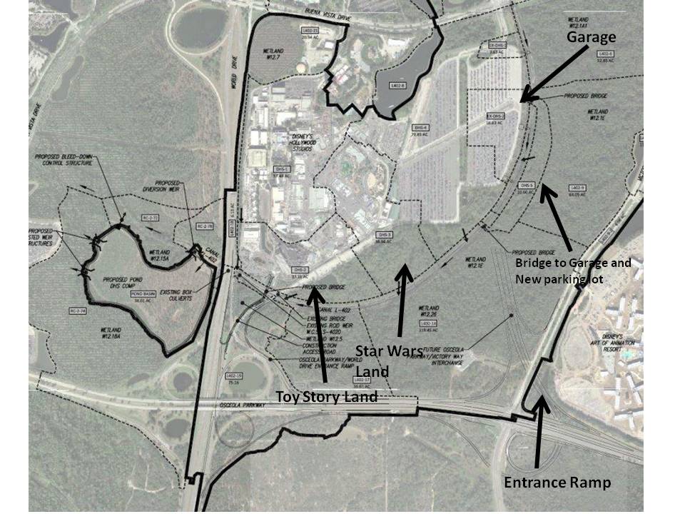 Finally, lets look at a potential garage and entrance ramp. Looking at the permit map, you will notice that a new entrance ramp on Osceola parkway, which looks like is leading to a bridge and another zone. I believe that this zone will be a parking garage, with a entrance ramp and bridge leading to a garage and another parking lot. I believe that the existing entrance will be turned into a bus entrance for the park and a employee entrance being relocated due to the Toy Story Land expansion.