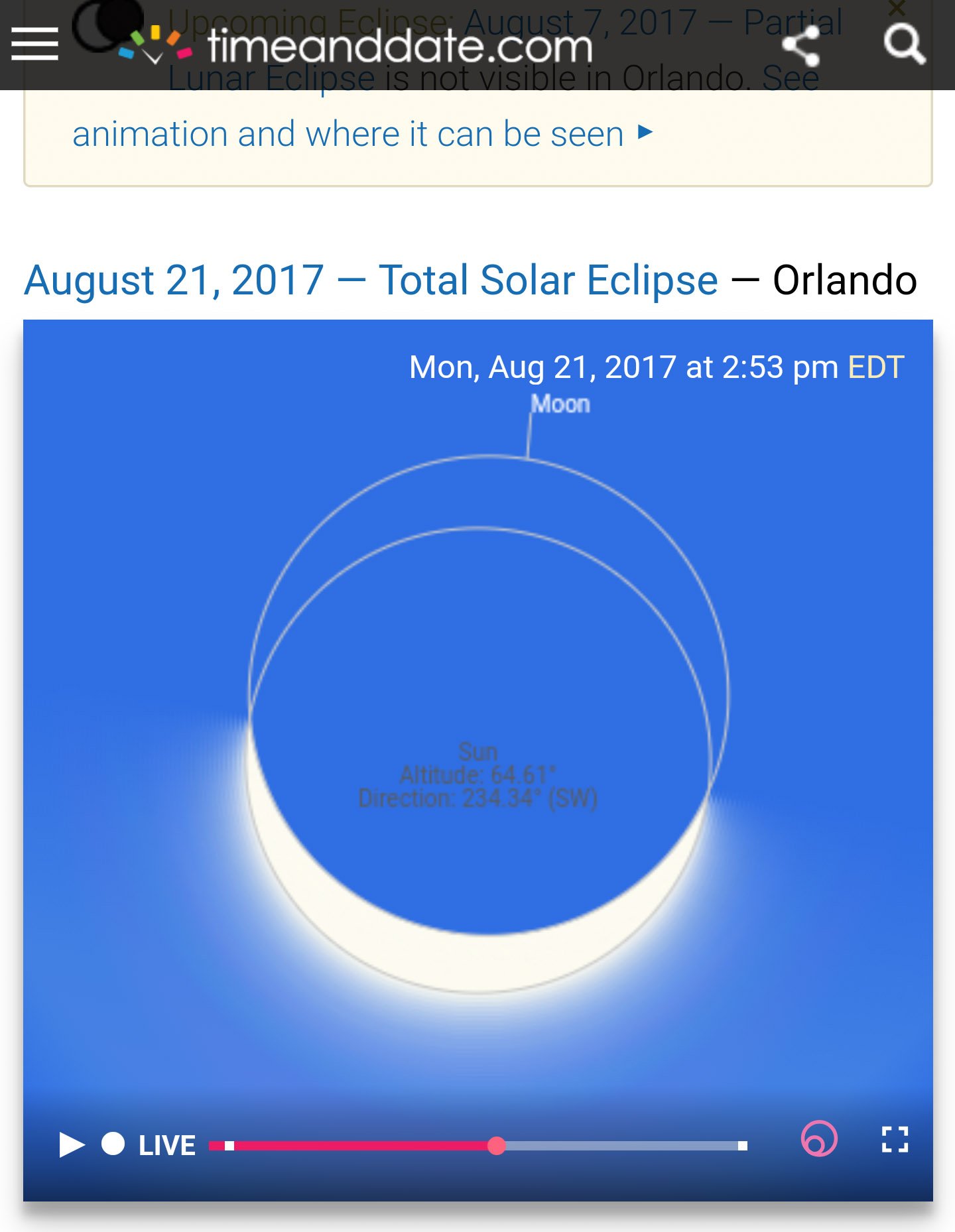 On August 21 of this year a total solar eclipse will be visible across much of the U.S. Central Florida will experience only a partial eclipse, but even so the sun will be up to 85-90% blocked for about an hour mid-afternoon. So, while it will not get completely dark, the afternoon will take on a very strange atmosphere.