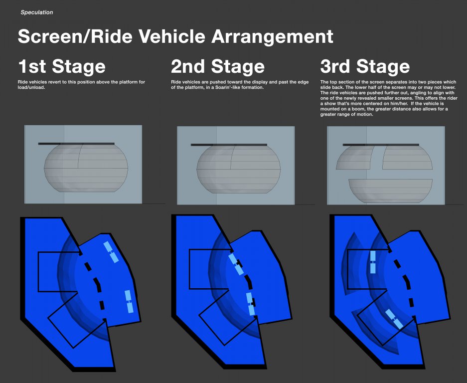 • The ride itself still confounds me. One idea that intrigues me is that rather than running all levels of one theater at a time (à la Soarin'), only one level of ride vehicles is in the ride at a time, while the other level unloads and loads guests. That's roughly the same system used at Tower of Terror in California and Paris. If it's a two-level system, this method could offer the same capacity as running both levels at the same time. If the ride is involved with so many moving screens, possibly props, and other effects, this system could simplify the show quite a bit by reducing the number of vehicles in the show at any given time to half. These reported moving screens could also rise or lower to meet whichever level is about to enter the ride.