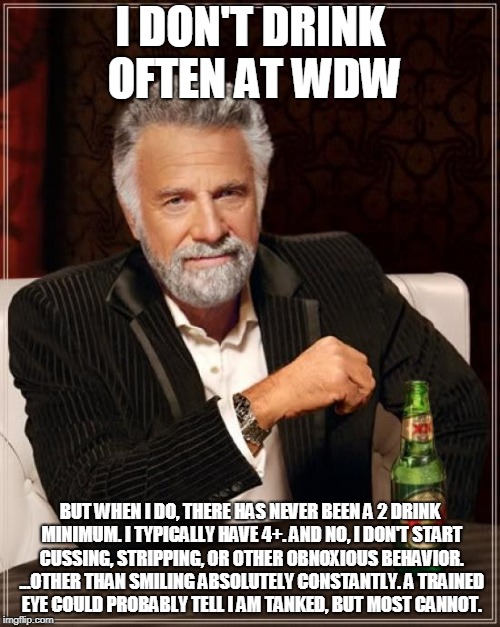 I don't drink often at WDW, but when I do, there has never been a 2 drink minimum. I typically have 4+. And no, I don't start cussing, stripping, or other obnoxious behavior. ...other than smiling absolutely constantly. A trained eye could probably tell I am tanked, but most cannot.