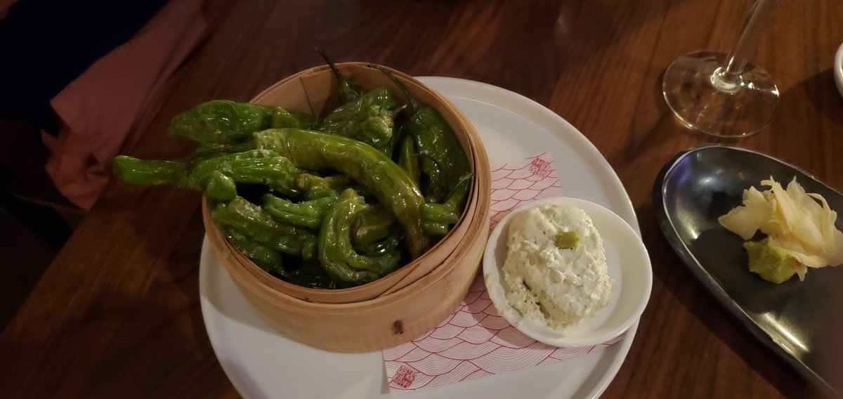 For my main, I went with the spicy tuna roll and blistered shi****o peppers. Hands-down the best sushi roll I've ever had and there was nothing fancy about it. The peppers were also very good. The sauce was a wasabi cream something. Nothing burned my mouth, but that wasabi kills your sinuses. I don't have a picture of the sushi, but it was the standard 5 pieces and whole fish, not mushed up like some tuna rolls can be.