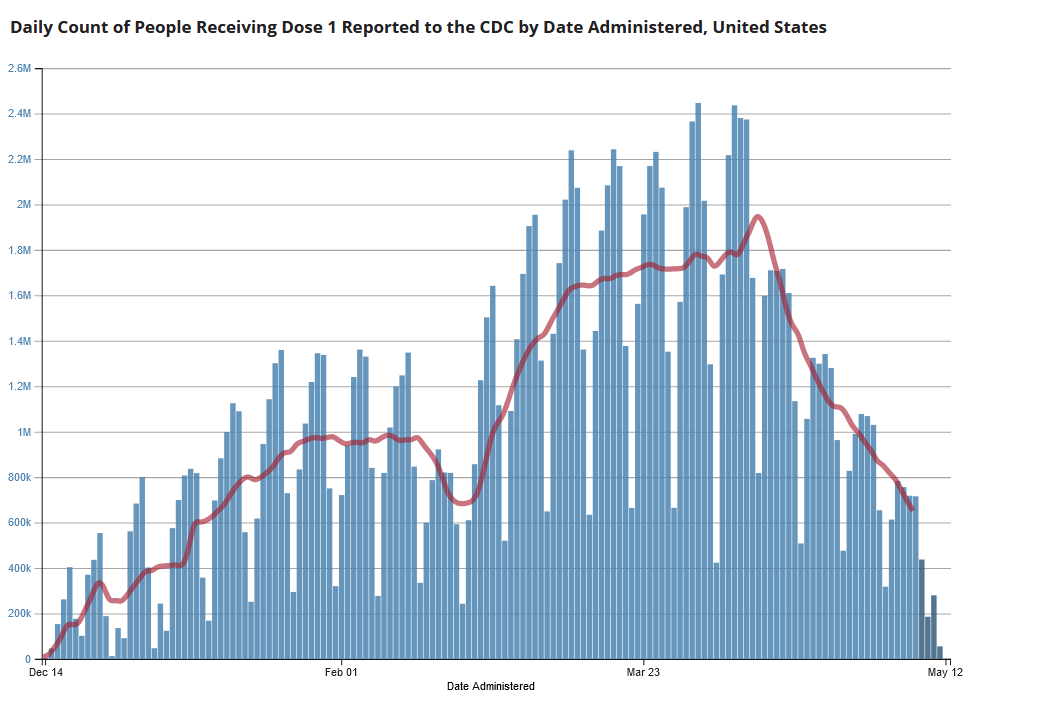Example -- in New York, which has done well: We have 63% of adults vaccinated. So we need about 1 million more adults to reach 70%. Sounds very doable -- Except, we are now down to 35,000 first doses per day. Keeping that pace, we would hit 70% by mid June. But if the pace slows down much more.....