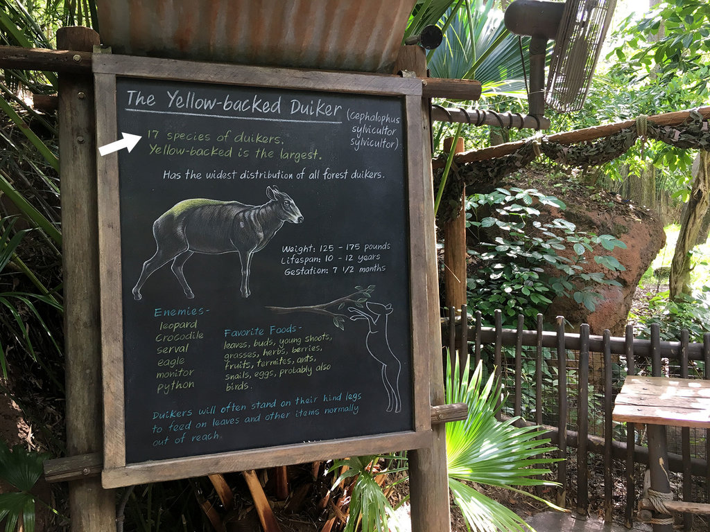 It is at the trail, but not the aviary. This is from the Yellow-backed Duiker sign at the Gorilla Falls (formerly Pangani Forest) Exploration Trail at Animal Kingdom.