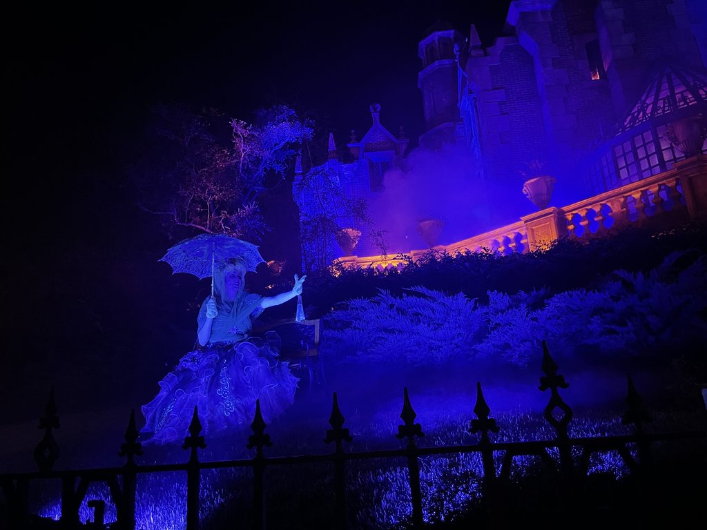 Then we headed over for a visit to the much maligned Under the Sea. Personally, I don't get it. Yes, the next to last scene is a bit lame and you can sometimes see the ceiling. But, the same complaints could be made about Pan and I never hear anyone make those! I guess it's just the promise of what could have been... Those two plus some strolling around got us to about 11:25pm when we finally did what this night is all about - The Haunted Mansion! Even though the wait was listed at 20 minutes, we only had to wait for the doors to open to the first room, there wasn't actually any real line. If you haven't heard about Lady Coletta entertaining guests outside the attraction, it is quite fun and looks awesome.