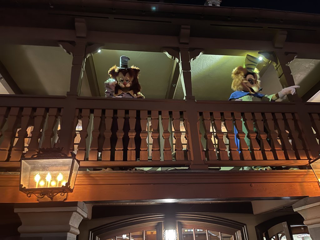As mentioned above, as soon as we were in the park, we headed to City Hall and scored some tickets for tonight's Boo Bash. Having never gotten to enjoy the limited crowds of the After Hours party, I'm really looking forward to it (assuming I'm still awake). BUT, on the way to City Hall, we had to pause for a quick moment as there were some characters out on the train station balcony. And not the usual ones for sure!