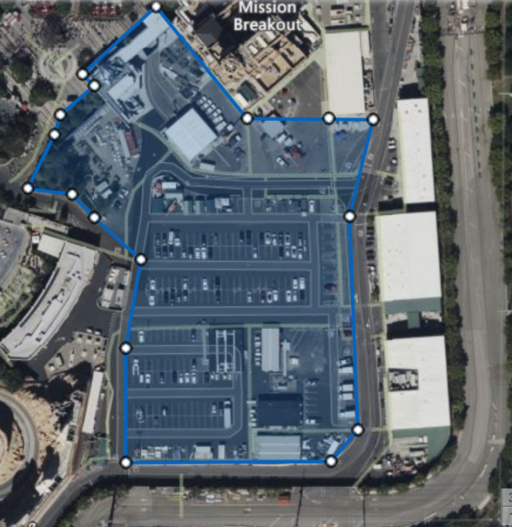 1. 4.5 acres: Original, maximalist measurement, assumes peripheral backstage buildings could be relocated into under utilized parade buildings or into a new multi-story structure behind Mission Breakout leaving only enough buffer for a backstage road: