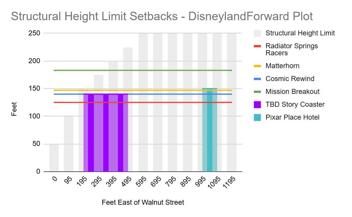 The chart below presents a cross-sectional West to East look at the DisneylandForward plot: Walnut Street on the left and Disneyland Drive on the right with the height limits and setbacks and some reference points of existing structures. The purple profile would be a hypothetical story coaster show building 300 feet in diameter built on the eastern end at first opportunity given the setbacks, while the turquoise represents the Pixar Place Hotel: