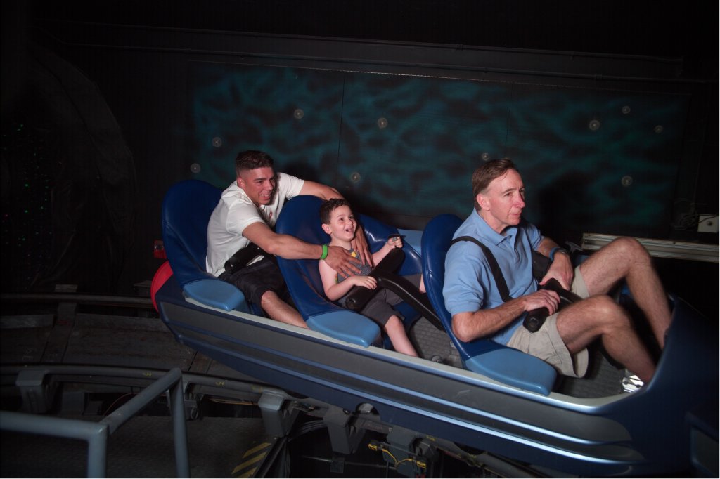 Look at his cute little face. He looks so happy. I think I had so much anticipation about EE that I was surprised how mild it was. It actually starts off kinda slow and even stops at one point. Then the backwards thing. Thats pretty fast. I think its the best coaster.