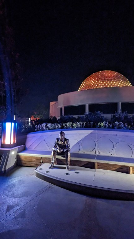 Pic was taken at 10:50pm. I think they shut off after photo pass left but could not swear to it. Or maybe they decided it takes a better picture without them?Now the 4 uplights for Walt aren’t working? Add them to list of lighting issues I guess. And the bench is still missing its bottom framing, as noted a couple days ago.