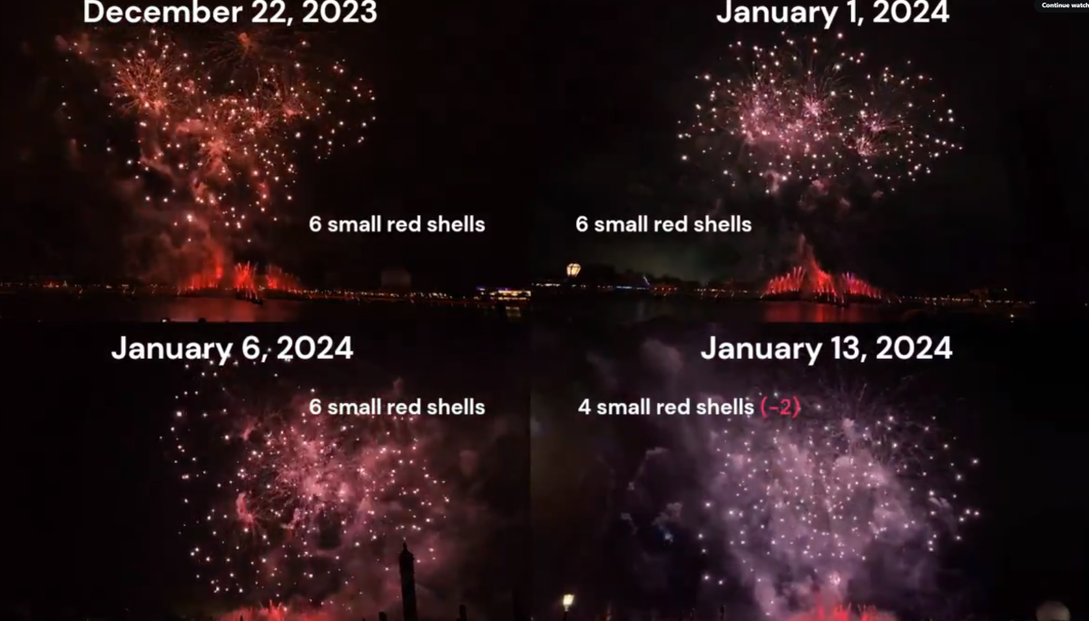 0:21 "Sound, it's in all that we are" – green crosette comets have a shorter burn/airtime (Changed around Jan 3)
