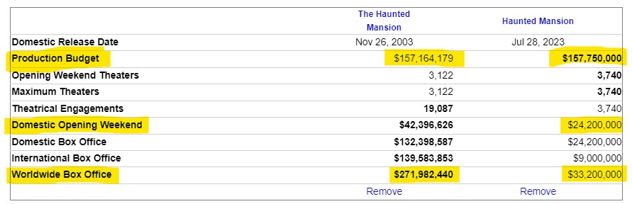 But the 2023 version had almost half of the opening weekend domestic box office as the '03 version did. On this trajectory, the new Haunted Mansion movie is set to lose at least $100 Million for Disney. (Barring some bizarrely huge success in overseas markets in August, as the film hasn't opened yet in some countries)