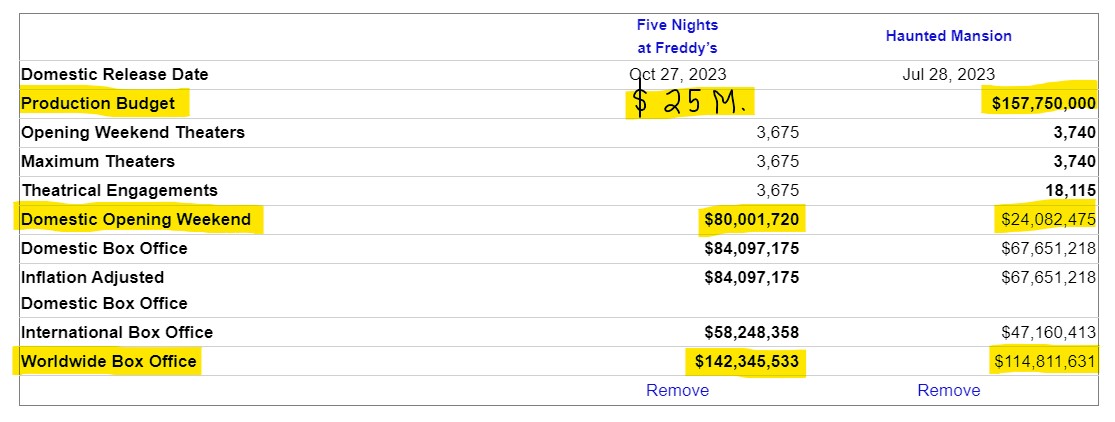 As for Freddy's, which many of us had never heard of until a week ago, I can't imagine it will have staying power at the box office. It's now November 1st, Halloween is over, and we're heading quickly into a slate of mega-budget family films to take us through Thanksgiving and Christmas. I would imagine Freddy's has a very steep drop off at the box office from here and is likely gone from theaters three weeks from now. A flash in the pan, if you will.
