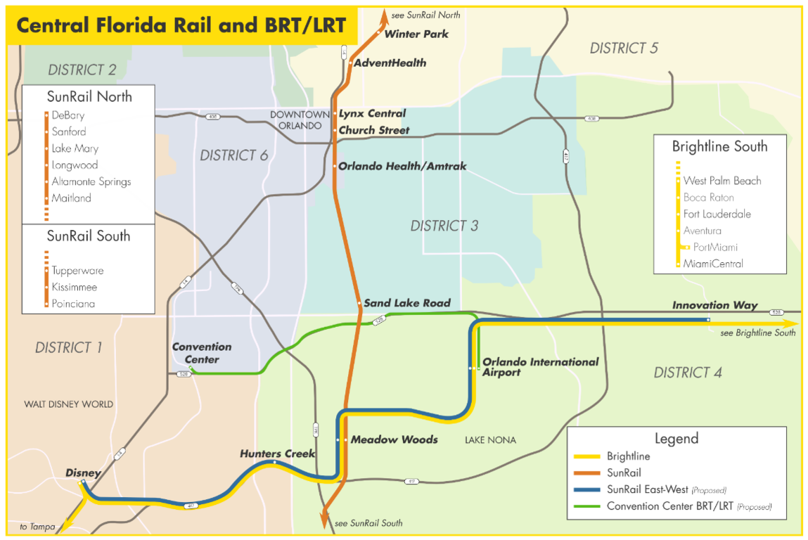- SunRail (proposed) sharing tracks all the way from Innovation Way in east Orlando, thru the airport, to WDW