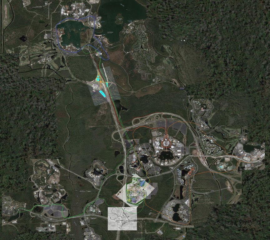 The design did its best to use existing track and roads to avoid having to develop swampland which could add to the cost. I also thought a little more should go into EPCOT so that the future begins upon parking (A futuristic parking pod near where the buses pickup could pick parking issues, maybe a connector to International Gateway?) and several lines could be seen joining towards Spaceship Earth as cars approach the parking. Also, the parking trams go into woods before re-emerging at the entrance. Walt was big on anticipation from the moment you arrived on the property and I tried to tap into that. It also bugs me all the existing parking at the TTC being so close to the lakes, even with the trees its a giant cement eyesore so I wish they would pull those back a little, make room for a few more resorts or even a fifth theme park (eventually, it IS already on there Master Plan in that area East of the current TTC). The park would then mirrors the MK on the opposite side of Bay Lake. What I envisioned though, was a "Walt Disney World Hotel" around that spot the way DL Has the Disneyland Hotel. and the next theme park south or southeast of it on the land north of EPCOT... This hotel would be the only able to link to any resort directly from the hotel lobby. All Premium/Moderate Resorts are linked in and I definitely think Disney would want Disney Springs to be on there somehow. I think an investment in an infrastructure of this scale, along with a Disney World Hotel and a new investment into EPCOT--A Sweden with a Matterhorn would be a start, (I'm nervous about a Guardians of the Galaxy anything in there I really hope they fit in some actual science and technology, a Tron coaster would be better in my opinion)... Animal Kingdom and DHS will both be full parks by then and be giving EPCOT a real run for its money...