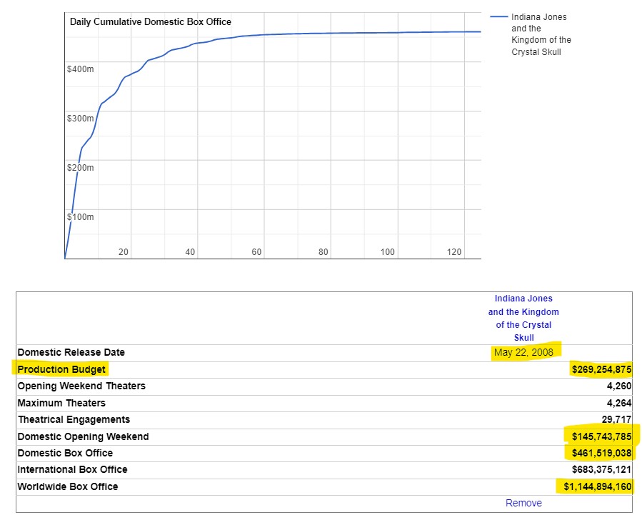 Financial analysis of Indiana Jones and the Kingdom of the Crystal Skull (2008) including production budget, domestic and international box office gross, DVD and Blu-ray sales reports.