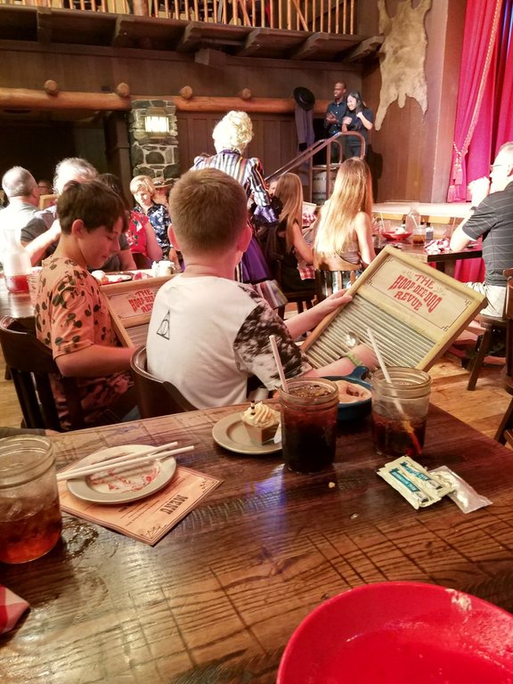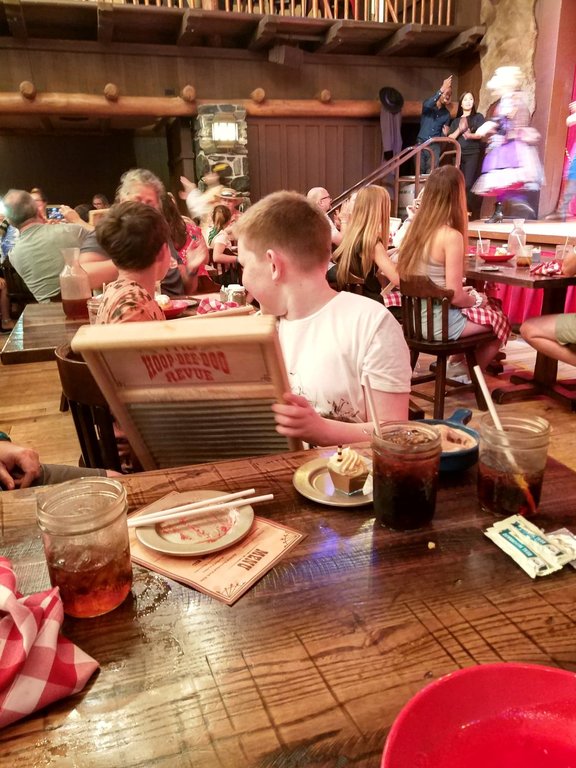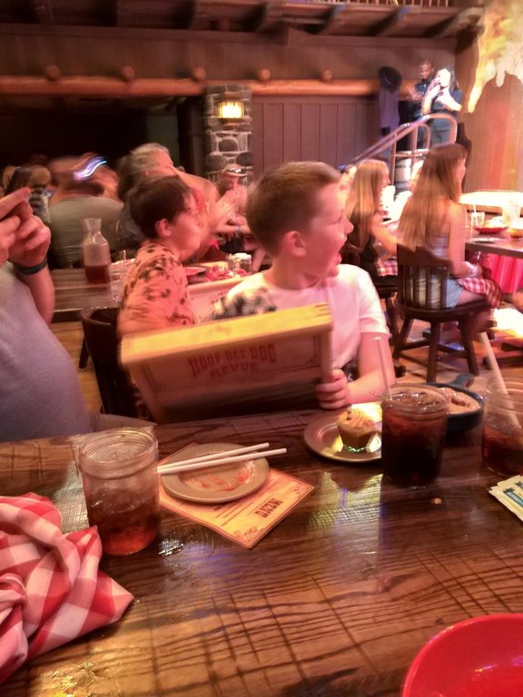 We were soooo close to the stage. Our server was Karen, and she was great! AJ from Disney food blog had mentioned that servers have a lot of power and that her server at Hoop-dee-doo once noticed her son wasn't eating and went and got him fries from the Trails End next door. I asked Karen if it would be possible to get fries for A because he won't eat chicken, ribs, corn, etc... She said no problem, and I felt bad a little later when I saw her bustling from table to table to keep everyone happy. The poor woman must be dead on her feet by the end of a shift! She also got A some chocolate ice cream since he wouldn't eat the berry shortcake. Cast compliment earned!