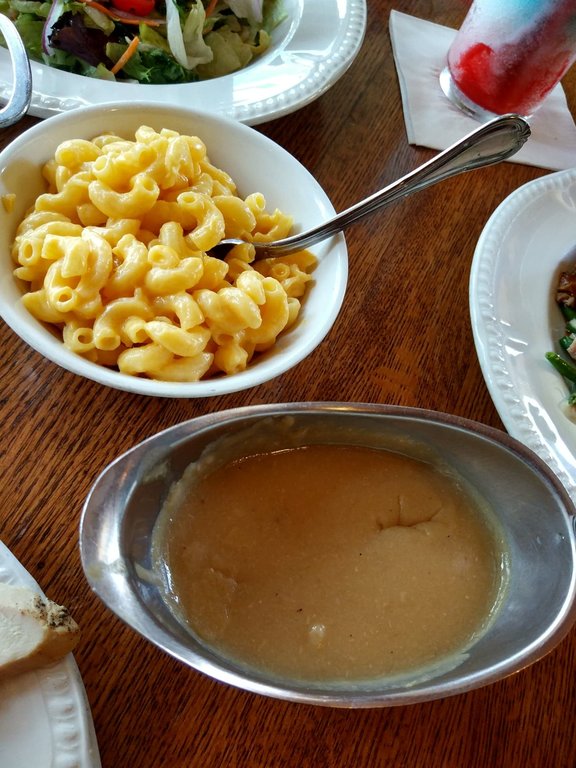 And then I taste the mac 'n' cheese. Well...they SAID it was mac 'n' cheese, but I'm not convinced it was anything more than wallpaper paste. It was NASTY. It was not smooth and creamy, but had a graininess to it, and there was no flavor to it at all....it was just like....mush. I immediately covered my mouth and told E that it was BAD and she should not eat it, and she looked at me and she asks "Are you being serious right now, or is this one of those 'It's so bad' because it's really good things." I told her I was absolutely serious. She of course wanted to know just how bad it was...so she tasted it. "OMG! That's awful!" I maybe should have complained, because wow was it inedible, but we had SO much other food that was amazing, it seemed petty to send back one dish and maybe get someone in trouble for it. And I don't like confrontation if I can help it. So we just pushed it to the side and ate everything else.