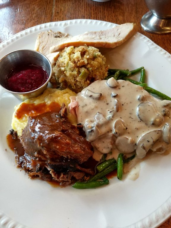 E doesn't care for stuffing, so she gave me hers. And same with the mashed potatoes. She LOVED the pork with mushroom sauce...I think she'd have licked that mushroom sauce off her plate if it was not considered rude. We ended up ordering more stuffing, mashed potatoes, and the pork in mushroom sauce. Our waiter was so great about it.
