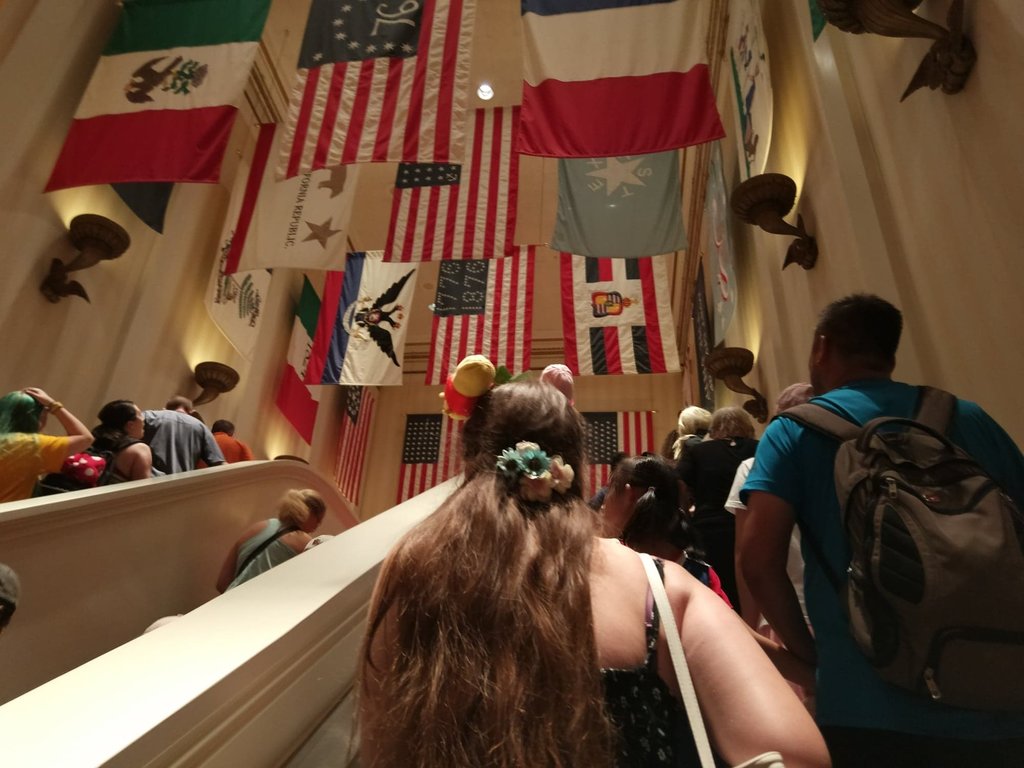 We headed to our FP for SSE, but even the FP line was YUGE. We changed that one to before dinner. I know...it's not efficient, running back and forth, but I had zero desire to stand in that heat for however long it took to get through the line. It's in full sun and I did not want a repeat of our first AK day, wasting hours trying to cool down after getting heat exhaustion. So we went back to the American pavilion for Voices of Liberty and American Adventure, since it had been cut short last time.