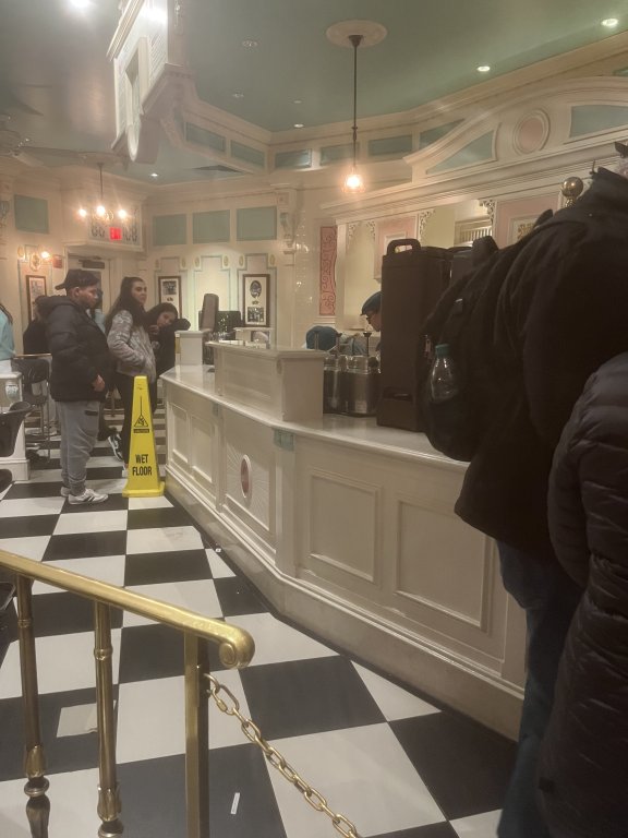 Dinner was done and I was not sure what I wanted to do. Wait times were kind of all over the place and believe Haunted Mansion was at 50 minutes. I passed these folks paying for their little desserts and prime fireworks viewing spot and I decided I wanted my own dessert.