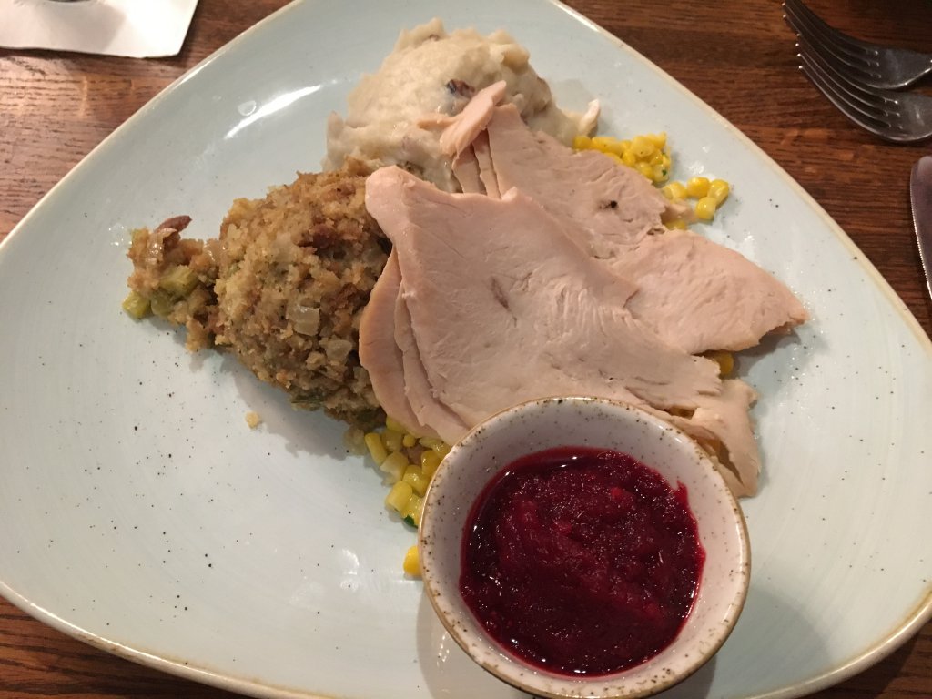 The Pilgrim’s Feast is turkey, mashed potatoes, corn, stuffing and cranberry sauce.