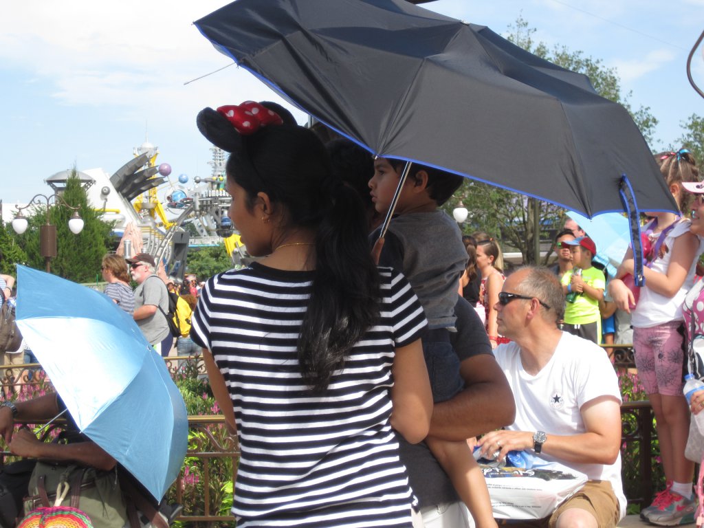 Eye poke hazard...banJust got back from a half day at MK, it was not too crowded, the sun was shining and it really wasn't that hot. The stage show was going on in front of the Castle so I thought I would wander over to see the hub crowd and how the guests were enjoying the new hub. I guess I have to say I was foolish thinking trees for the benefit of shade was necessary when all that is needed is to whip our your umbrella and presto, instant shade. I didn't realize that all the people behind these umbrellas really didn't care that their view was being blocked. This photo is around the planter in the dead center of the hub and there are three umbrellas visible. Problem solved.