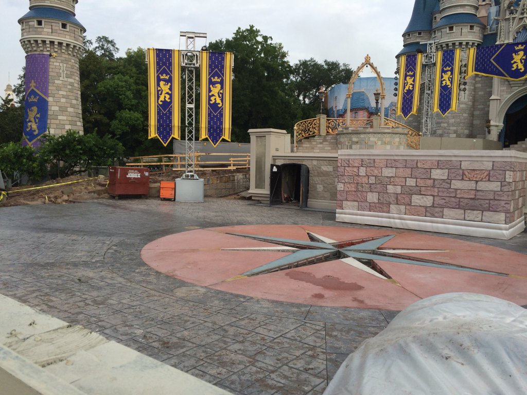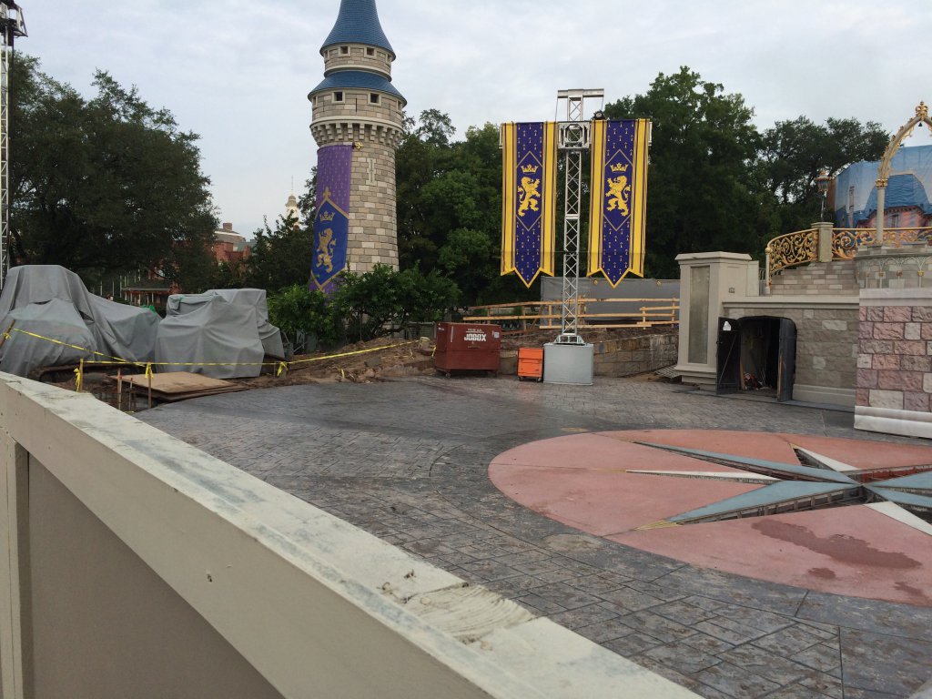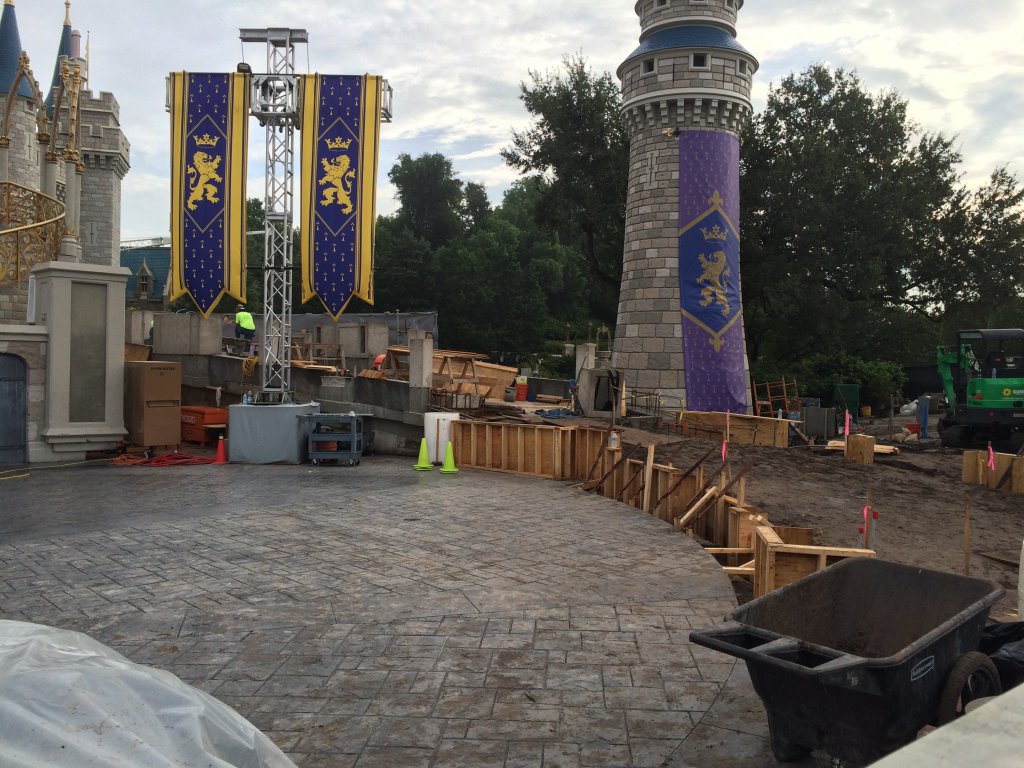 Didn't take photos but rebar is in place for the east side ramp so I would expect concrete soon. West ramp is still dirt.Photo update as of Wednesday, Sept 9. The center of the castle forecourt was open today for guests, with castle stage shows taking place. A temporary stage extension is in place for this weekend's Night of Joy concerts. Low construction walls are still on either side of the forecourt as the ramps are still under construction.