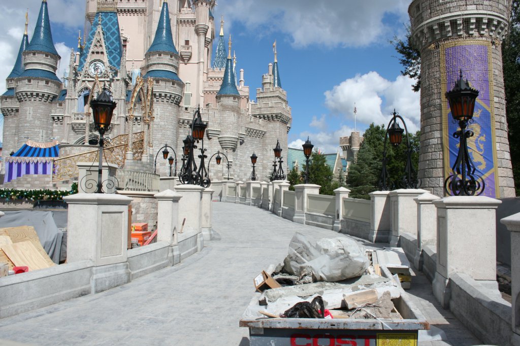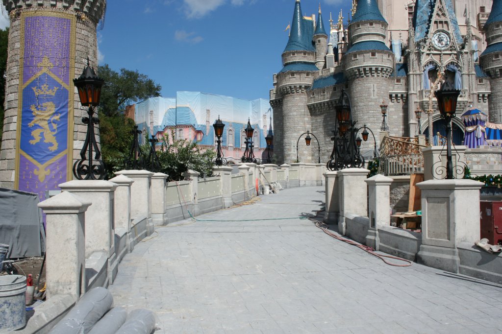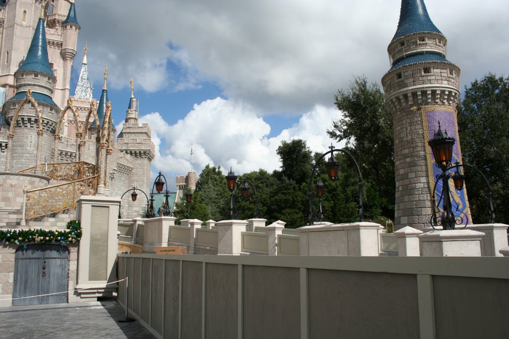 Is anyone else less than enthused with the look of the "railings/walls" on the new castle ramps? They look rather utilitarian and bleak. I hope whatever finishing work they have left will make them look a little nicer. Did they need to make them solid for safety reasons?Photo update as of Wednesday, Nov 4. Construction of the ramps on either side of Cinderella Castle.