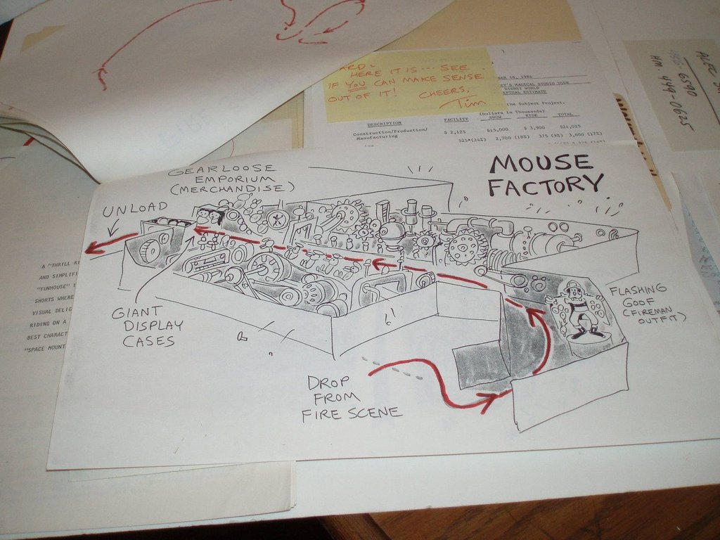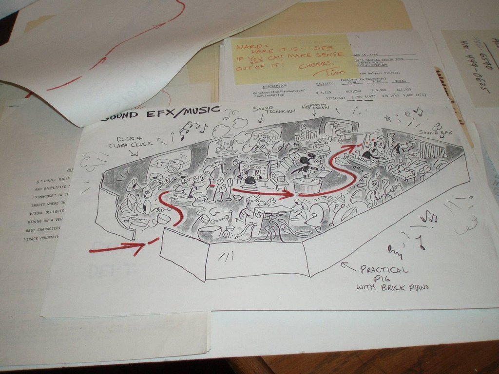 However, I have precious little information to go on about Mickey's Madhouse, mainly because they give so little information pertaining to it. All I know about it is that it was going to be a thrilling dark ride/roller coaster hybrid based on the 1930s black-and-white Mickey Mouse cartoons and set to rollicking ragtime music. Ward Kimball had designed this ride to be an indoor attraction, through a handful of scenes of old Mickey cartoons (about five or six in all). But that's really about all I know about it.