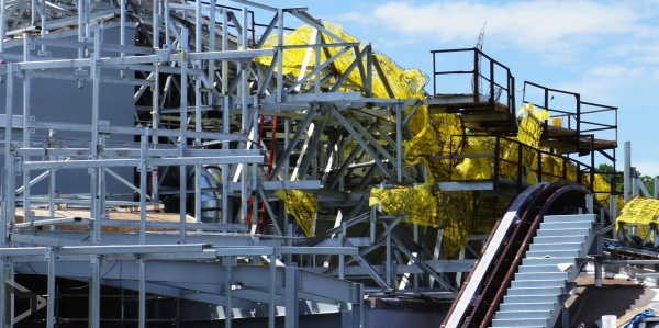 Looks like there is evidence of the fake mine shaft right in this picture, you have a floor (part of it covered with tar paper, and the metal support structure to obviously hold a roof over this section, this is exactly where the fake mine entrance is supposed to be! East of the second lift hill, which is interior I believe. (No reason for a weather proofed floor here unless you've got something like a mine entrance. Makes sense that this area could be exposed to the elements as it has a pretty good slope which will run off any blown-in rain fairly quickly, which I hear it frequently happens in Orlando.