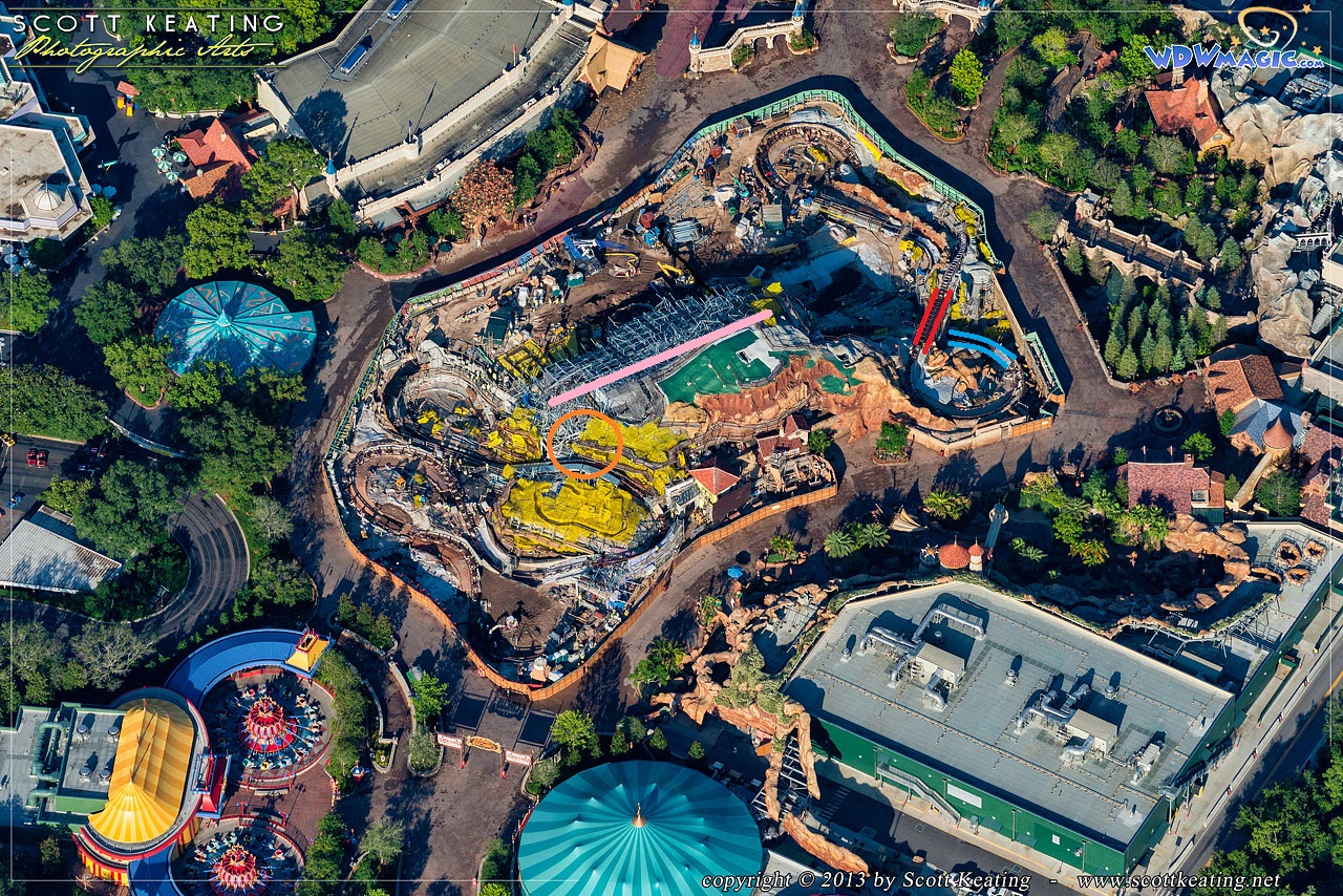 That concept art doesn't really jive with anything we know about the attraction, but I'm wondering if it was half right. It doesn't make sense for the log bridge to be at that main crossing, but there still must be a crossing somewhere over the waterfall. I'm not 100% clear on where the waterfall is actually going to be, but perhaps the log bridge is going where I show in red on this picture, with the waterfall being the blue area? Somewhere the lower portion of the helix must be crossing water, unless the waterfall is on the southern side of the helix or (and I doubt this) the lower helix goes under the rockside of the waterfall.