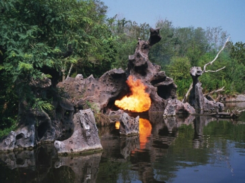The Imagineers didn't get the money needed, so all they had was a cave that emitted fire. The Imagineers decide not to put that armor out so it wouldn't "call attention to a show that wasn't much of show". After DR Boats close, the cave just hisses now.