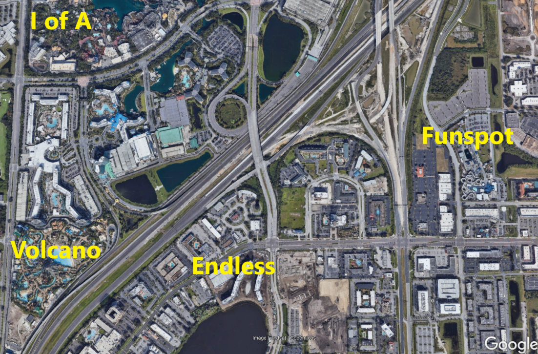 Aerial look at Universal's Endless Summer Resort. Opening of Dockside Inn in foreground is delayed due to pandemic. Surfside Inn across the street is open.