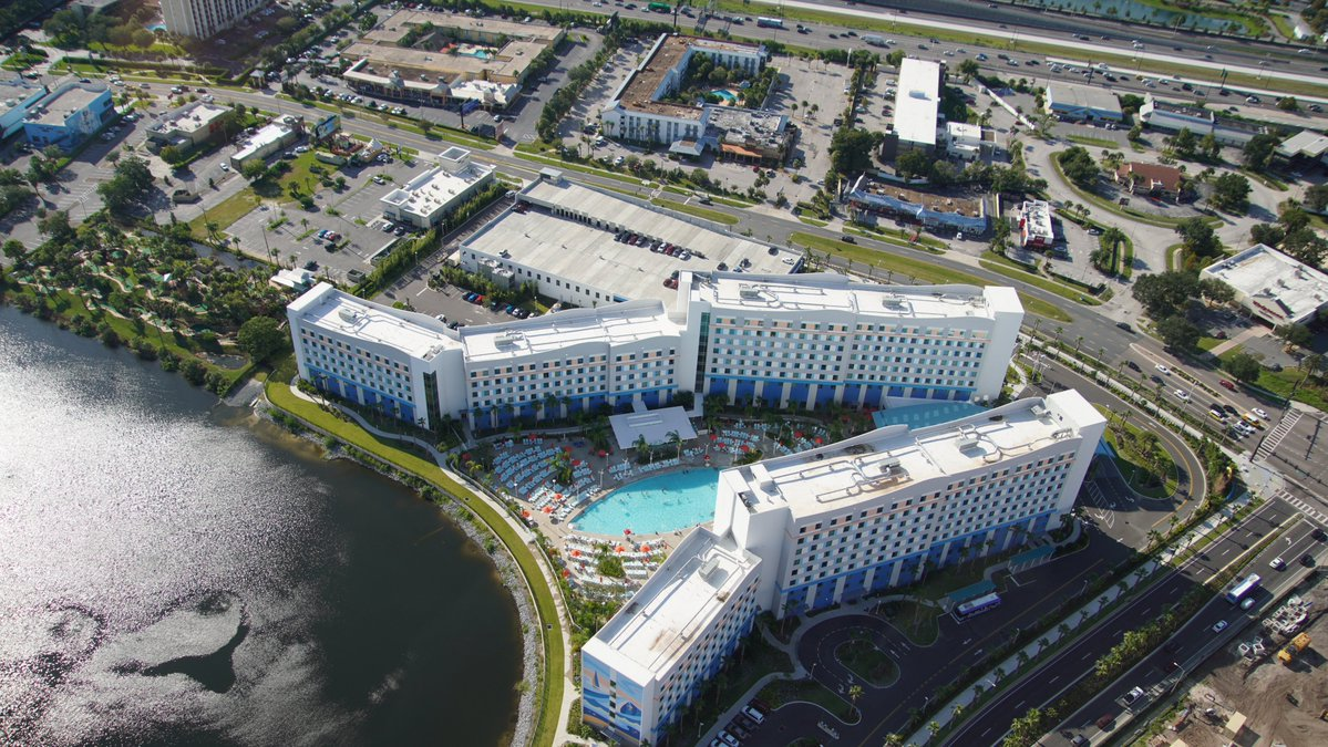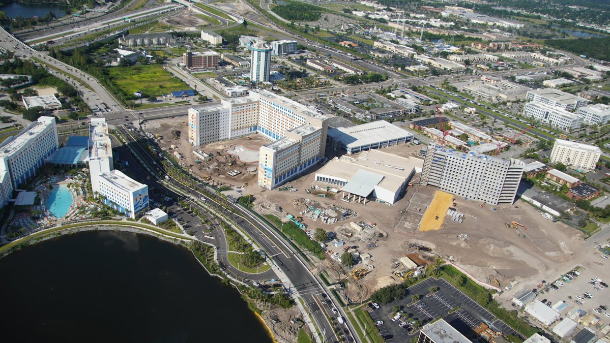 Aerial view of Universal's Endless Summer Resort, with Surfside Inn at center of photo, Dockside Inn under construction across Universal Blvd.