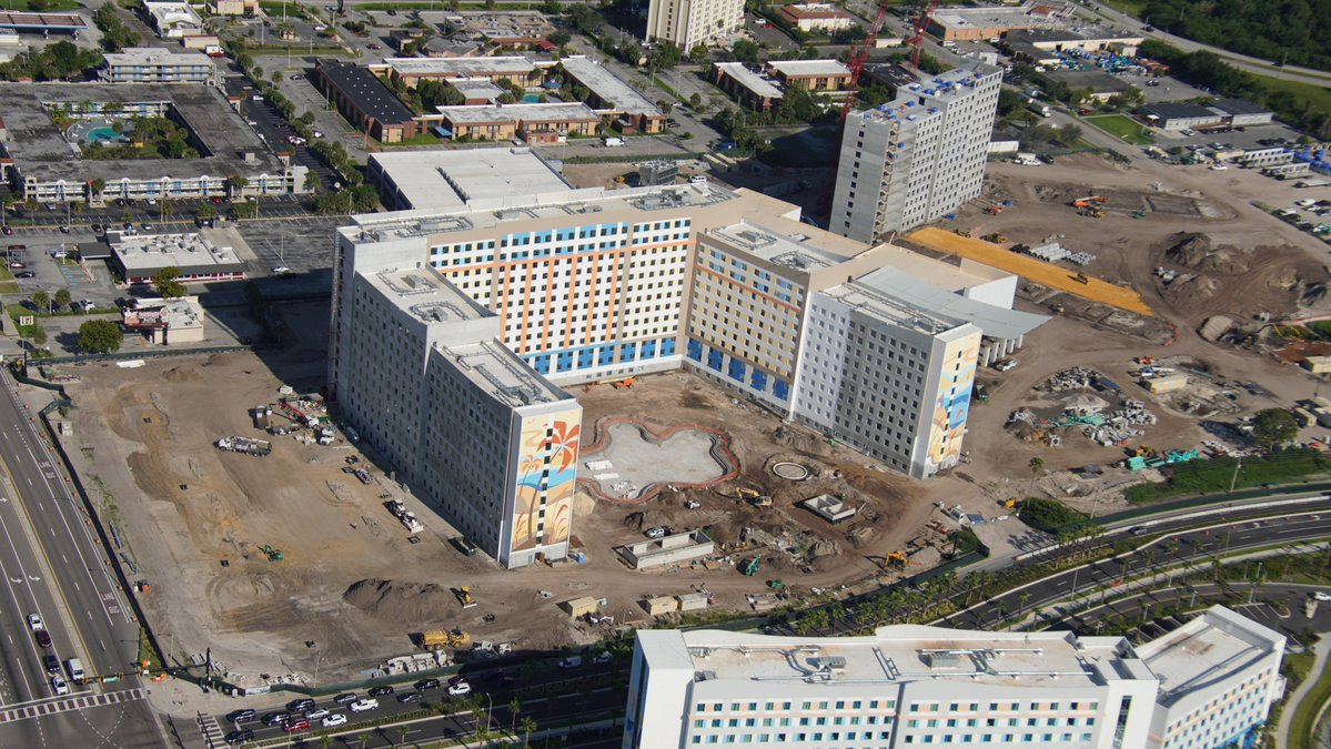 Aerial view of Universal's Dockside Inn. The second room tower is rising at right, foundations for its wings are seen.