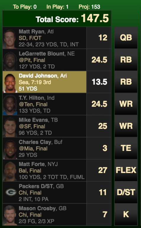 I'm currently up by 18 points, and I need the Vikings D to give up a lot of points, as well as Alshon Jeffery to not get many points. I lost for the first time last week by 40 points... 114-154. I really don't want to lose two weeks in a row!