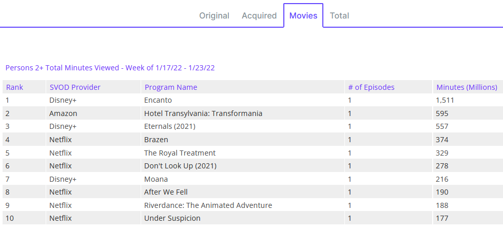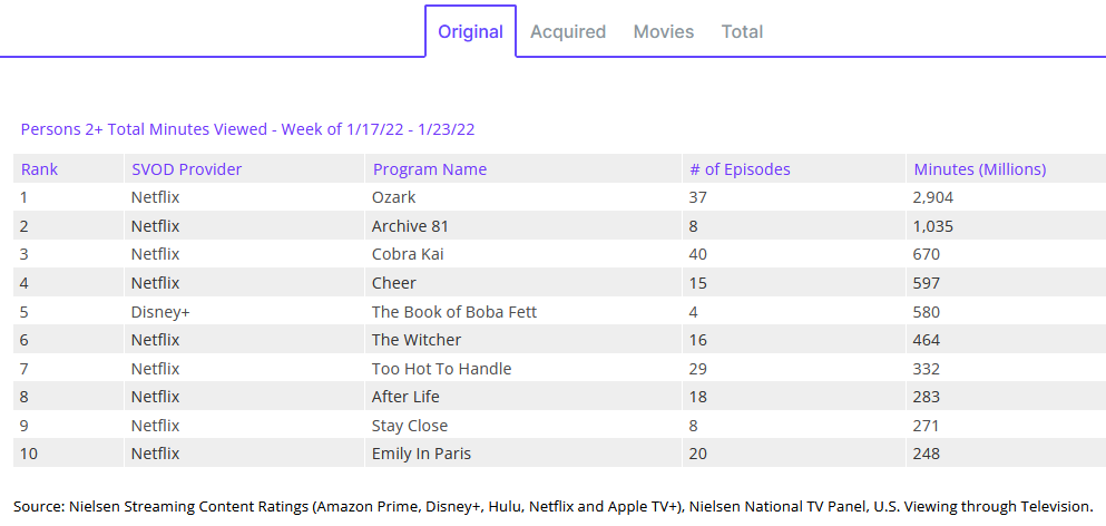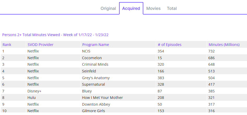 It depends on how they consider "acquired", does it mean owned by someone else and then purchased to be reshown on the streamer. Or does it mean second run no matter who owns it? What about shows that didn't originate on the streamer but the parent company who originally produced the show is now owned by the streamer, such as Fox content now owned by Disney. And what about shows that didn't originate on a streamer but has since been picked up by the streamer for new seasons, where does that fall?Not that I necessarily think that they will get enough views to appear on this chart, but I would guess the Netflix Marvel shows that are going to appear on Disney+ will be considered in the "acquired" category, right?