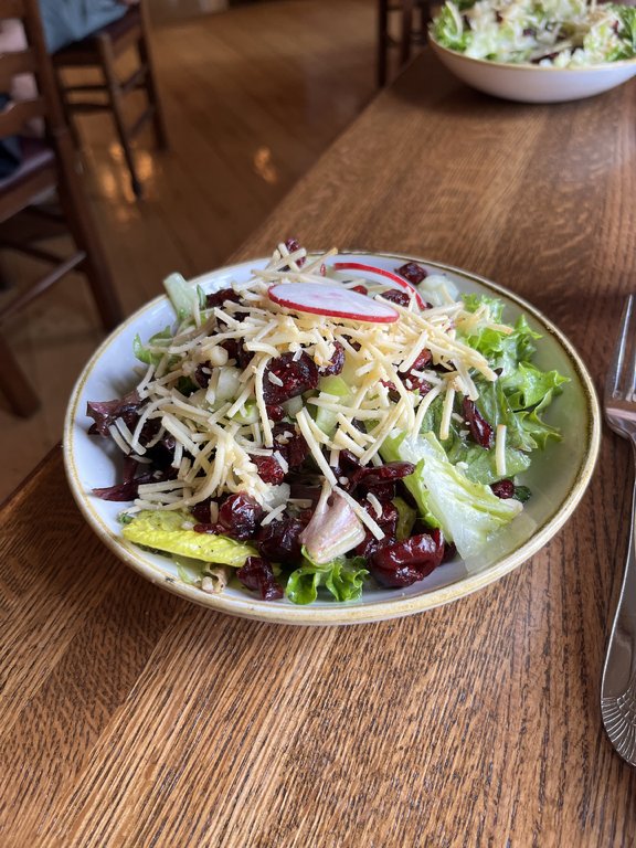 Speaking of the salad, it now contains cheese and cranberries. I love LTT’s salad dressing, but the cheese overpowers the light taste of the dressing. Woody doesn’t care for cranberries and had to pick around them. We were surprised that we each received our own bowl of salad rather than a communal bowl.