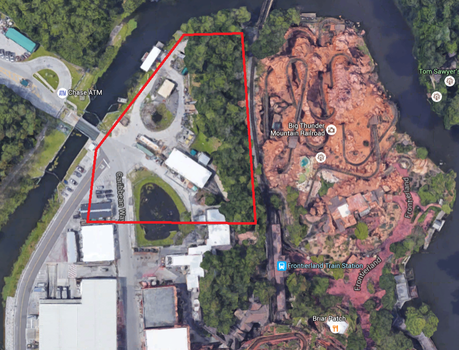 This expansion pad is kind of impossible. Disney would need to make a pathway from the area outside the railroad in Frontierland through the castmember area, over the "river", and to that area. For what? A restaurant and a few gift shops? And maybe a petting zoo? It's not worth it. They would have to build a path where you can't see any cast member or backstage areas. Then they have to build a bridge that looks like it was built in the frontier times. Disney can do it, but probably not in the near future. It would cost some big bucks too!