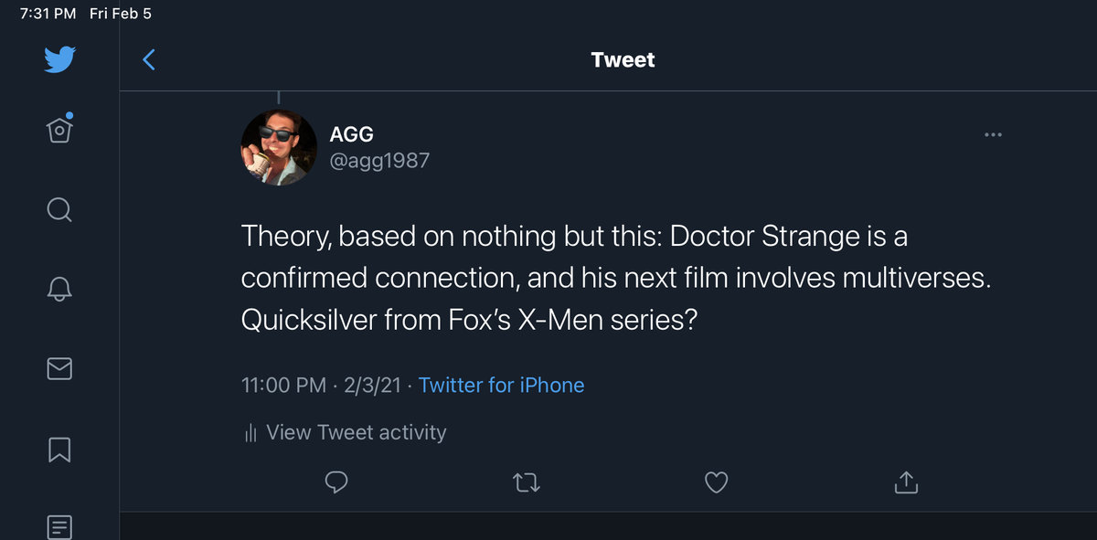 But agreed that we don't know what's going on yet. Though it was weird that Wanda described Pietro as being far away rather than dead. Was she in denial (though she definitively refused to do anything about the dead dog) or was she sensing a multiverse Pietro? I've only watched the episode once but my immediate reaction to Wanda's reaction to him at the door was confusion rather than recognition. Is she surprised to see him there and that's what the reaction was or was she like 'who is this guy and why is he wearing ATJ's clothes and wig?' Guess we'll find out next week!