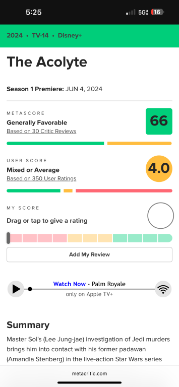 Critics’ opinions don’t matter as much; let “The Acolyte” play out and see how the audience reacts. Word of mouth will be the true indicator of its success. Shows like “Fallout” and “Three-Body Problem” have been well-received, and “Suits” experienced a resurgence on Netflix due to positive word of mouth.