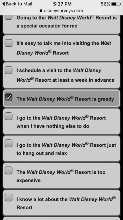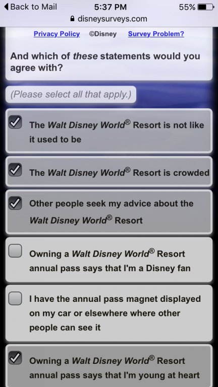 Today I got a survey from WDW. The topic was Annual Passholder benefits. Questions were largely as you'd expect, but one question asked me to check off which of several statements in a list that I perceive as being true. I got a good laugh out of some of them.