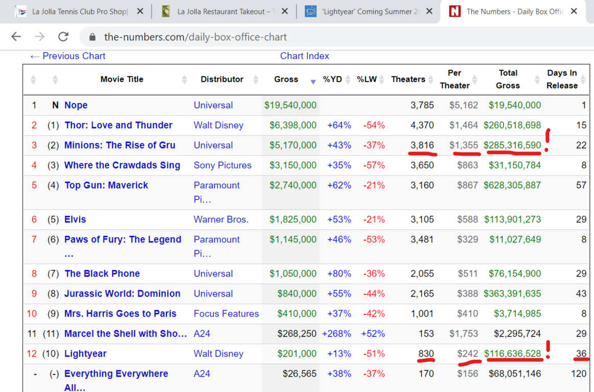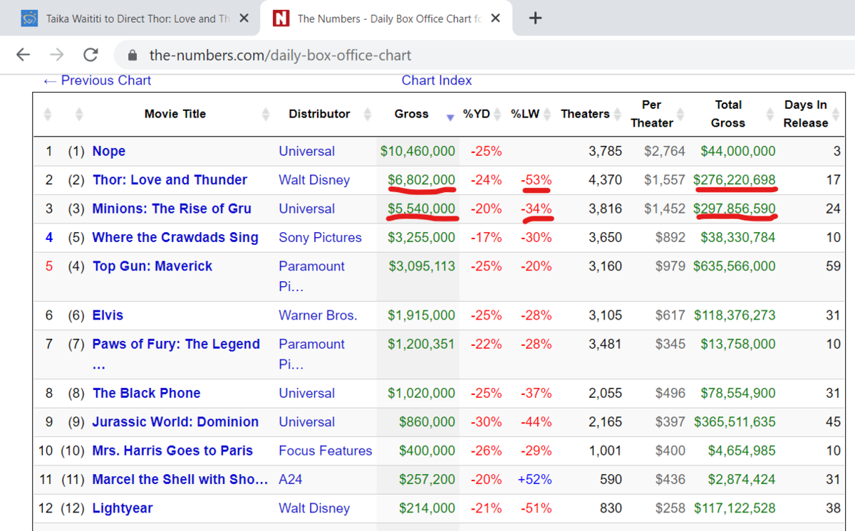 I think next weekend will be the true test as another animated film, DC League of Super-Pets, hits theaters. Will that cause a dramatic drop in Minions box office, enough for Thor to make up ground? Or will the influx of families cause a rollover wave into Minions continuing its current trend.