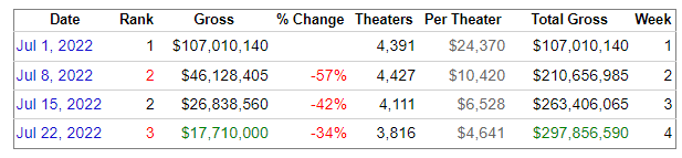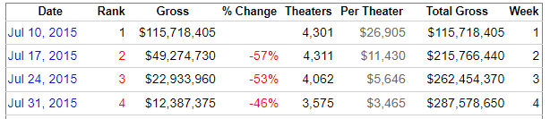 Compared with Minions, that film is dropping at a slower rate, with 57% in its 2nd weekend, 42% in its 3rd weekend, and 34% in its 4th weekend. But it also opened at $107 million compared to L&T's $144 million.
