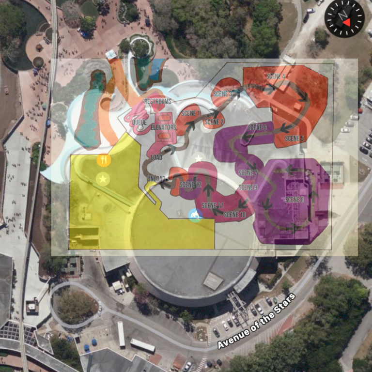 Like, you have our entry path lined up with the irl ride entrance for the Seas. But if our entry path lined up with the irl post show exit path there'd be plenty of room to add the coaster queue on the side there.Okay this is basically what we’re looking at for a footprint.