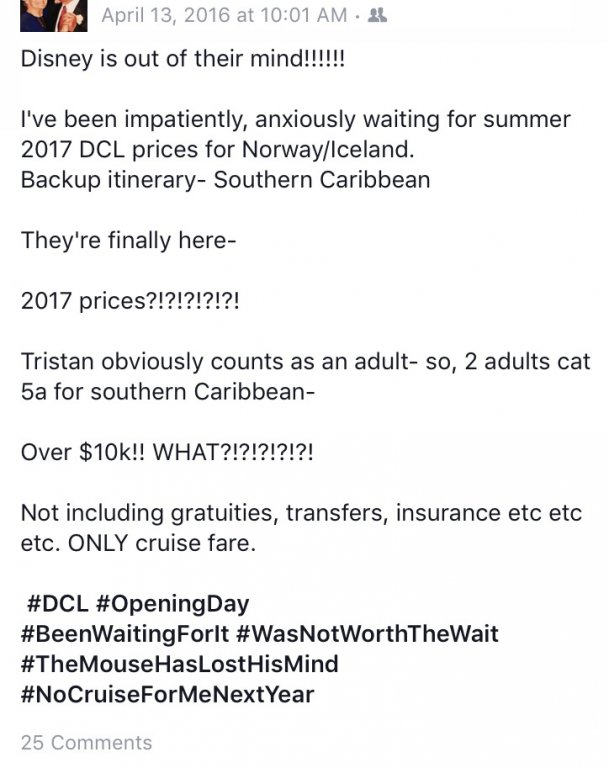 DCL Eastern and Westerns aren't too bad depending on the time of year. Thanksgiving week on the Fantasy is only $1k more than my NCL cruise. I hate to say "only" but as a comparison, a Southern Caribbean is more than HALF the price.