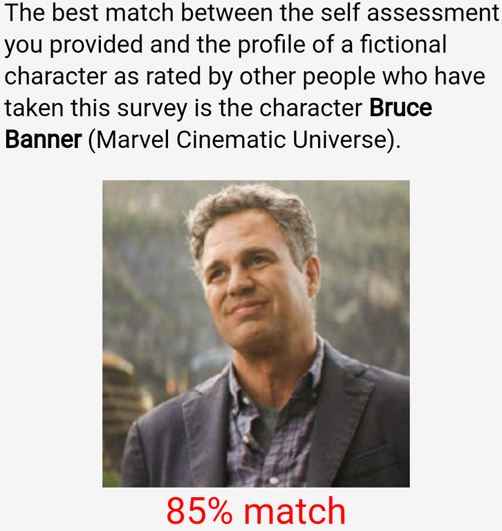 Perhaps you should be B Hulk?Okay, so I took a quiz that matches you to to one of a wide assortment of characters from different fandoms and, well...