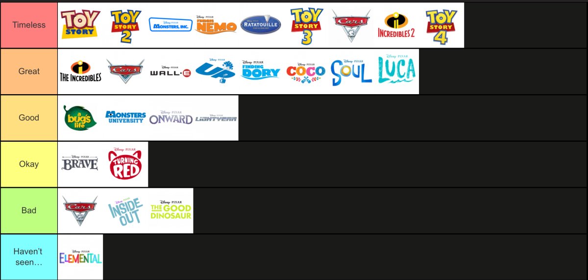 I wouldn't be opposed to doing the occasional tier list as a way to keep the conversation going in between big releases.For a example here’s my ranking of all the Pixar movies, I’ve seen almost every one, except elemental.