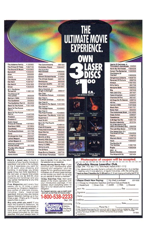 Look at this, I found an ad for the Columbia Laserdisc club. Yep, I did get all 3 Star Wars discs for a buck each. Just had to buy 2 more within a year which was easy to do and ended up with a hell of a deal back then.